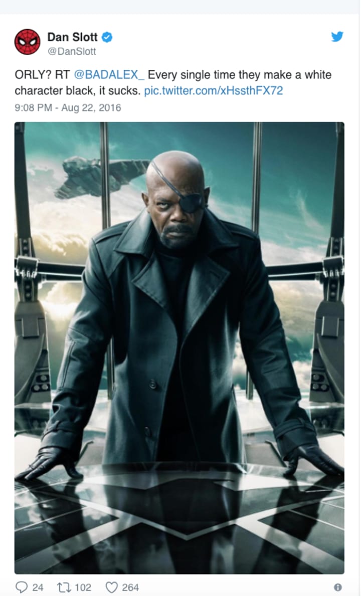 Meanwhile, many superhero films have added diversity by race-swapping characters. This is usually done by changing the ethnicity of a traditionally white character — think Samuel L. Jackson's Nick Fury, or Michael B. Jordan's Human Torch. Before you argue that Nick Fury doesn't count, because he was black in Marvel's "Ultimate" universe, I can only agree with #Marvel writer Dan Slott: