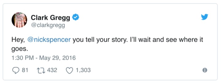 It is an amazing thing when your heroes go to bat for you. Really, truly grateful for it.— Nick Spencer (@nickspencer) May 28, 2016