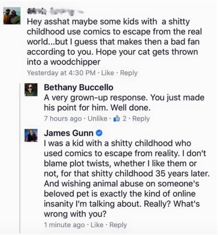 Even the big names of the MCU are getting drawn into the furore! After a dismissive Facebook post, James Gunn — director of the Guardians of the Galaxy films — has wound up on the defensive. The image above gives an idea of just how much heat people are getting, and it's more than a little disturbing.
