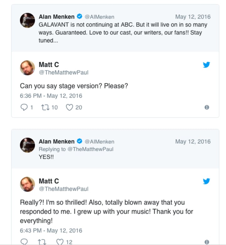 I am glad that we had Galavant for the time that we did, and I wish the cast and crew all the best of luck in future projects.