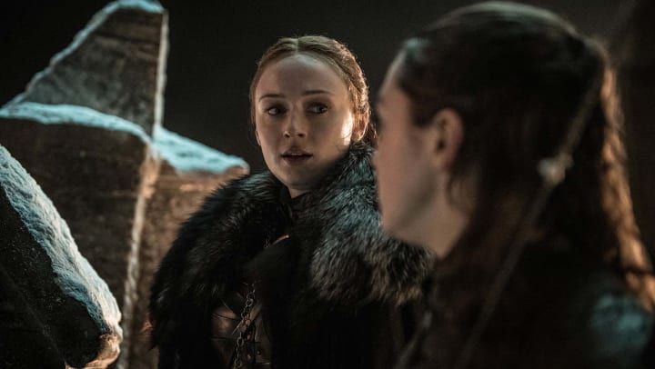 -Arya, teaching Sansa how to use a dragon glass dagger—using the same words that Jon Snow taught her with in Season 1 Episode 2—before the Lady of Winterfell headed for the crypts.