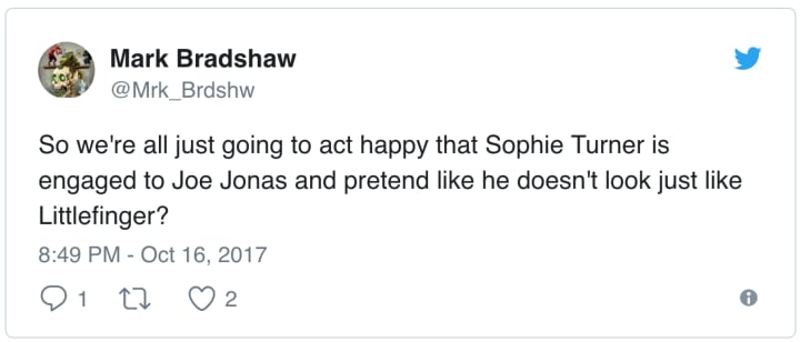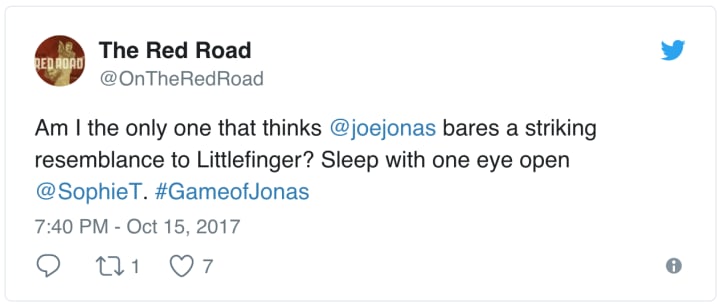 As happy as we are for them, many fans are amused by the fact that Joe Jonas looks strikingly like Peter Baelish, another influential #GameOfThrones character. It took a moment for the fans to notice the similarity, but then Twitter was flooded with tweets comparing the two: