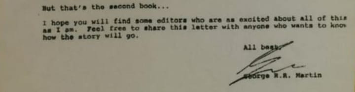 We are now heading into the tail end of HBO's Game of Thrones, which has graced our screens with its blood since 2011. There are said to only be two final seasons, and even these could be reduced in length (cue beheading emoji)! Whilst the show has distanced itself from George R.R. Martin's books, the books we have today aren't even how Martin originally intended his A Song of Ice and Fire saga to play out. Last February the Harper Collins Twitter page posted an early proposal letter dated 1993 from Martin to the publishers. Whilst the tweet was quickly deleted, its contents is still floating around reddit, tumblr and deep-web pages. Think of this as Ramsay's letter to Jon Snow, but with less/more rape (depending how you look at it). For those hoping that the contents of this letter will reveal how the show ends, tough luck, some sneaky Snow has blacked out the all-important last paragraph. Nevertheless, spoilers to follow, so let's take a look at how it could've happened!