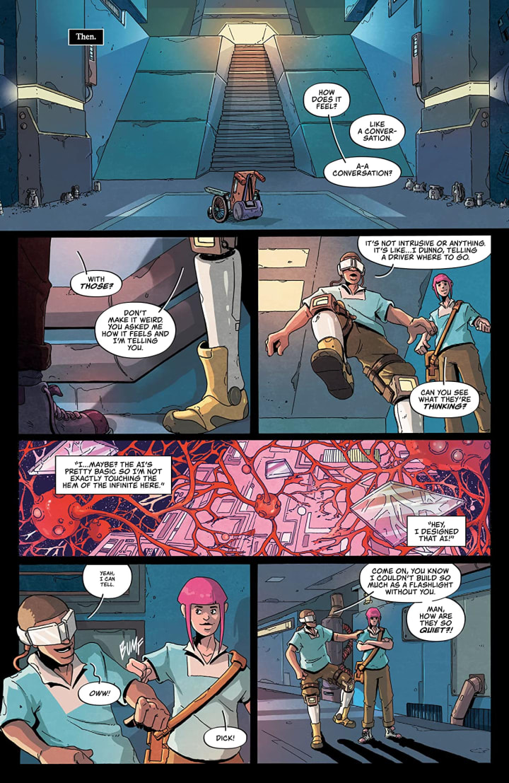 I am a huge fan of the way that this is being told. How we see the story & plot development through watching the sequence of events unfold alongside how the reader learns information is presented exceptionally well. I honestly hadn’t expected to see what we see at the neck though the language I had expected to see but i’ll get into that shortly. That was a shocker to me and I enjoy it when we see the unexpected occur. The character development that we see is fantastic! The guards who are little men in a position of power, to themselves, and speak like they do show how small and insecure they truly are. Now what I do love seeing is Evan and Track who while have a convoluted history really do trust each other in ways many wouldn’t understand and we see that portrayed so beautifully here. The pacing is superb and as it takes us through the pages revealing more and more of the story culminating in that cliffhanger ending it has this way of drawing the reader in so they don’t want to leave.