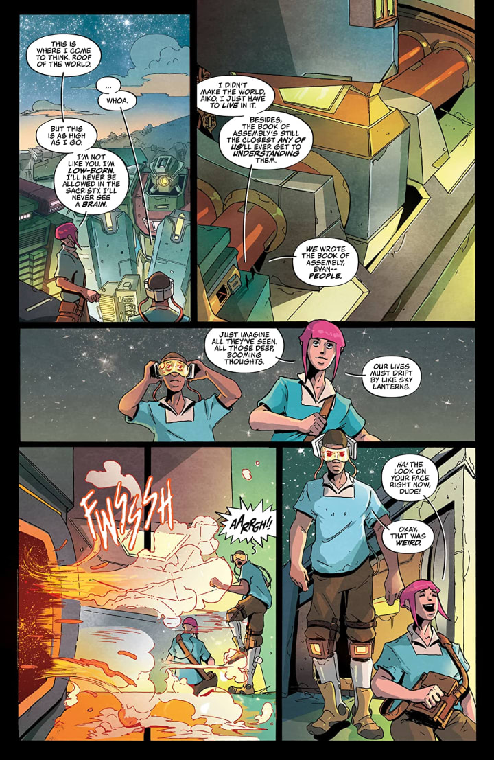There is something about this book that is completely and utterly fascinating to me. To build their cities out of Mechs that have seeming shut down and in my humble opinion lie dormant seems a little excessive, or overkill, if they are trying to save themselves from those who live on the ground. Of course I suppose if they didn't live there they could hijack the technology and fake being more advanced and civilised than they truly are. The whole mishegas with Evan and the religious group was probably the best thing that ever happened to him, and yes I am fully aware he lives in the slums but he’s a free thinker now and isn’t blindly following along lapping up what they are trying to feed the masses by the spoonful. I like that we open up here with a look at the past with Aiko as it pertains to the present and what’s going to happen, I love foreshadowing.