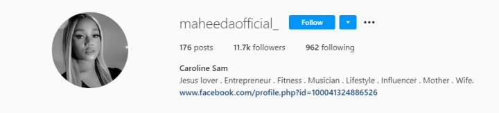 The link in her bio leads to her Facebook page which tells once again a very different story from the Maheeda we’ve come to know. Her Facebook bio reads: