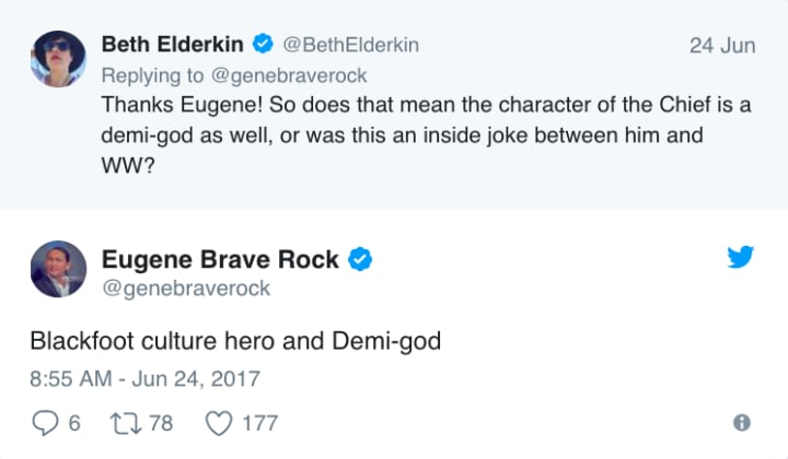 Writing on Twitter, Eugene Brave Rock gave another level of mystery to his character of Chief. Thanks to a translation in a movie review by Indian County Today's Vincent Schilling, we have already heard that Wonder Woman may have introduced Chief as a demi-god akin to Diana — but Brave Rock just went and gave that hypothesis a big green tick in the yes department: