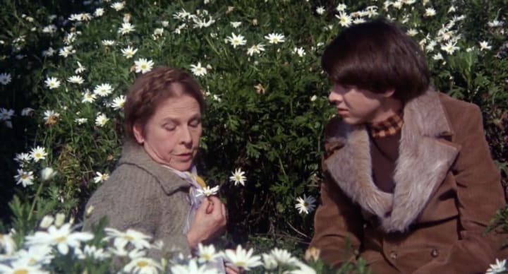 I was in secondary four when I first came across this film (grade 10 for those who are unfamiliar with the Montreal school system), and my teacher thought it appropriate to have us watch it throughout a special lunch break during which we were fed pizza and fries in class. My classmates and I had just completed Boris Vian's "L'Écume des Jours" (Froth on the Daydream), and our teacher wished for us to make comparisons between the unconventional nature and offbeat contraptions found within both works. As we did not know what to expect of the film, the start of the lunch hour brimmed with frenetic idiocy, and our classroom unsurprisingly turned into a circus, but our wild behaviour was slowly tamed by the pictures on the screen. Many of the boys were so appalled at the growing love story unraveling before them, the movie had to at one point be paused due to a kid, seated next to me, who nearly hurled out his pizza in revulsion at the sight of Harold and Maude being intimate with one another. I, on the other hand, albeit disoriented as well, found myself bizarrely moved by their romance and could not help but admire the couple's outlandish activities. At one point, Harold tells Maude he feels like doing summersaults but does not want to seem stupid to which Maude responds "Harold, everyone has the right to make an ass out of themselves. You just can't let the world judge you too much." While my classmates never attempted rewatching this movie, I got the strange urge to do so a few times in my life when all seemed to hit rock bottom, and each viewing inexplicably brought me peace of mind. Majestic art, in a nutshell.