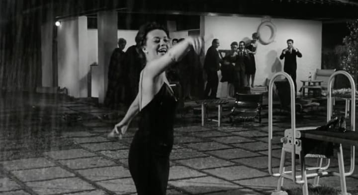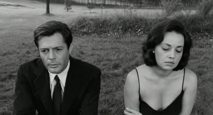 The film's plot is relatively simple. A woman named Lidia and her husband Giovanni feel as if they have grown apart in recent years, and on screen is depicted one day in their mundane married lives. Granted, there are minor incidents that serve to advance the film: a visit to their dying friend, Giovanni's book signing, a brief moment at a nightclub and a party the couple decide to attend at night. However, as is such in every other film within Antonioni's trilogy, it is the characters' emotional detachment with respect to each of these individual incidents that drives the film more than their actions do. Frankly, I could not care less about any of the aforementioned incidents. Lidia sobbing outside a hospital, wandering the roads of a bygone neighborhood, pouting during the entirety of a socialite's party only to roar with excitement when the party is showered with heavy rain... These are images that prove more impactful than those quotidian episodes ever could and are the main reasons why Antonioni will forever be cemented as one of the all-time great film directors.