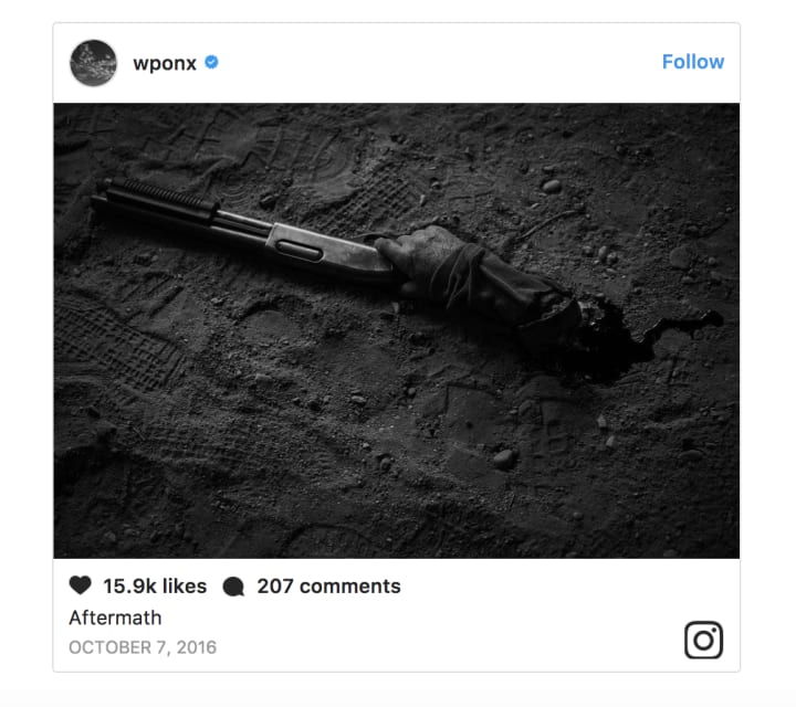 In the image, we can see a severed hand, holding a shotgun; the caption only says "aftermath," which doesn't add any context. Now that we've learned Donald Pierce is missing one of his hands, it is quite possible this Instagram post from the @wponx account is an image of Donald Pierce's severed hand. Multiple members of Pierce's Reaver team appear to have missing extremities as well, so it could also be one of theirs.