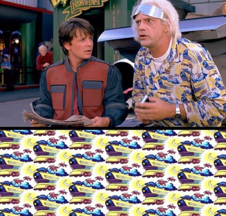 During a sequence in Back to the Future Part II, Doc and Marty have traveled to the year 2015. As Doc discusses the various ramifications involved with interacting with futuristic individuals, you'll notice that he's sporting a colorful shirt. The shirt featured cartoon trains amidst a yellow sunset and a two horses galloping against the pillowy smoke emanating from the train.
