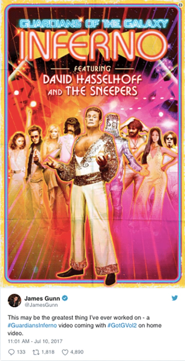Well, it appears that now fans can appreciate the glorious song in an entirely new way when Guardians Vol. 2 arrives on DVD and Blu-ray — in the form of a music video. Via Twitter, Gunn announced the news with the assistance of a rather stunning poster for the video with the Hoff front and center, surrounded by Gunn and much of the Guardians decked out in full disco attire.