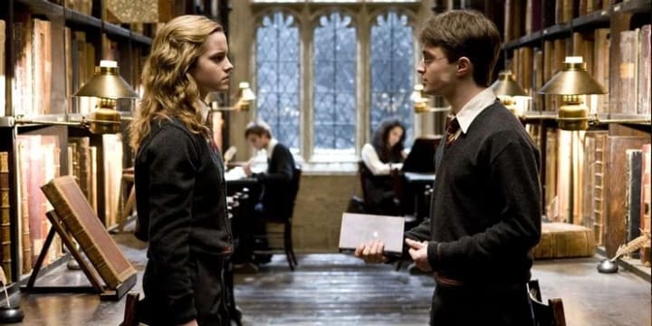 Harry can be a little thick sometimes. When Hermione reveals that Romilda Vane has her eye on him, he's interested. But Hermione snaps her fingers in front of his face. "Hey! She's only interested in you because she thinks you're the Chosen One."