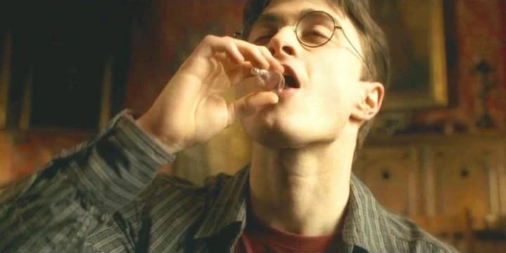 Harry, Ron, and Hermione devise a plan to extract Slughorn's memories of young Tom Riddle, which involves Harry drinking Felix Felicis, or Liquid Luck. Almost immediately after downing the potion, he's incongruously chipper.