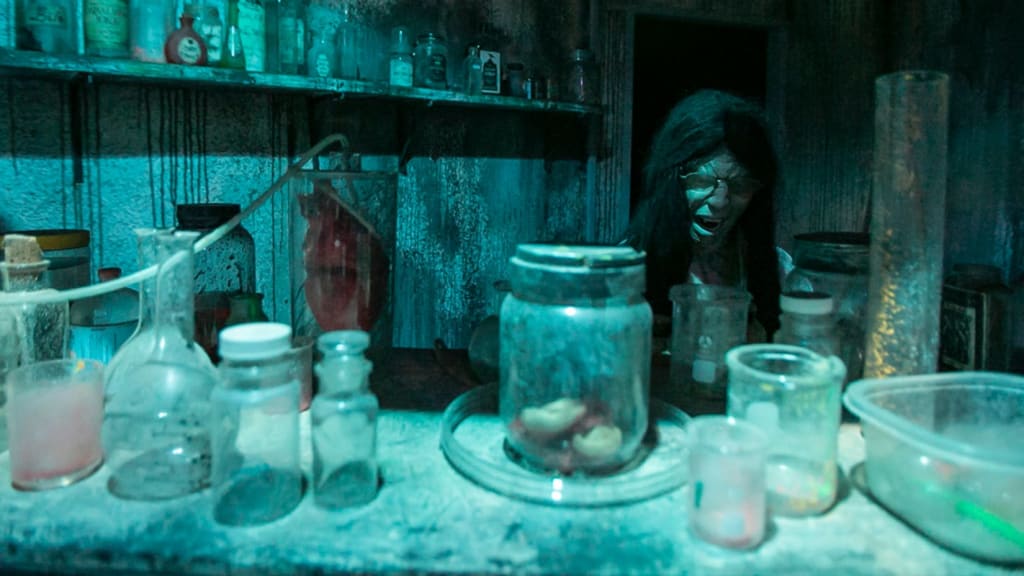 Since the first day of his haunted house gig was before his first day at the grocery store, he took advantage of the fact that the lights were on in order to navigate the haunted house for the sake of familiarity. It was one of his first jobs and the last thing he wanted was to lose his ability to breathe as a result of getting himself lost. At some point, he made his way to some curtains with some small doors close to the floor. As he made his way into the room, he bumped his head lightly on something and he saw what he bumped it into: It looked like a detailed plastic lizard head with yellow eyes. As he felt the lizard, he noticed that there were handles and some buttons sticking out at the back of its head.