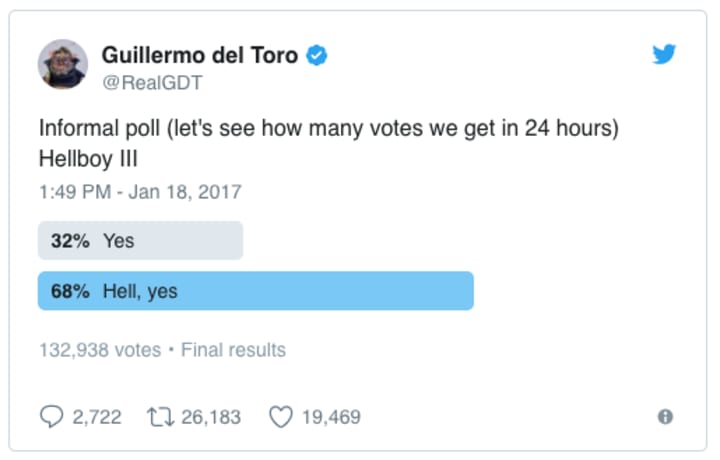 According to del Toro, after his interest poll for Hellboy 3 went out, the response surpassed expectations and became the reason why he's deciding to produce another Hellboy movie; made evident by his latest tweet