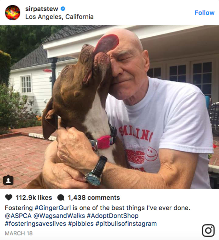 Looking at Hugh Jackman's 17-year tenure alongside Stewart as Wolverine, it is clear that Logan was one man who didn't skimp on the push-ups. Patrick never looked particularly buff under his Starship uniform or when wheeling around the Xavier mansion, but looks can be deceiving. Only the other week he posted a picture of him spending some quality time with his new pooch Ginger, and jeez, welcome to the gun show: