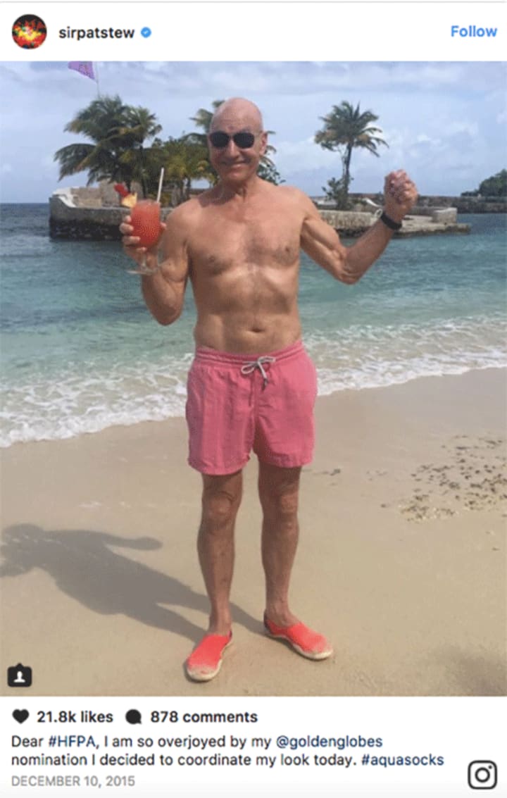 In 2015 he posted a picture of himself on the beach, leading many to ask, "Yo Patrick, what's your secret?" While constant walks with his dogs and a wife that is half his age will undoubtedly keep him on his toes, according to the captain of the Starship Enterprise, it isn't bathing in the blood of newborns that gives him his youthful glow. Speaking at the Golden Globes, Stewart said "Push-ups. It's that simple."