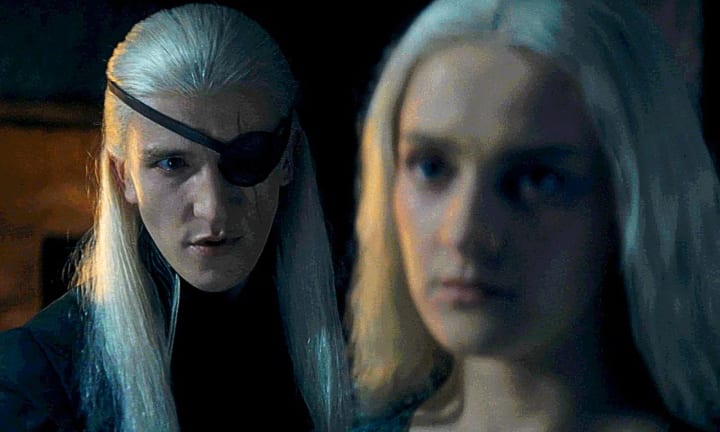 - Queen Helaena Targaryen (Phia Saban) to King Aegon II (Tom Glynn-Carney,) prophetically foreshadowing their son Jaehaerys’ death at the hands of assassins Blood and Cheese—one of whom works as a ratcatcher in the Red Keep—hired by Daemon Targaryen to kill Aemond Targaryen for murdering Lucerys Velaryon in S2E1, “A Son for A Son.”