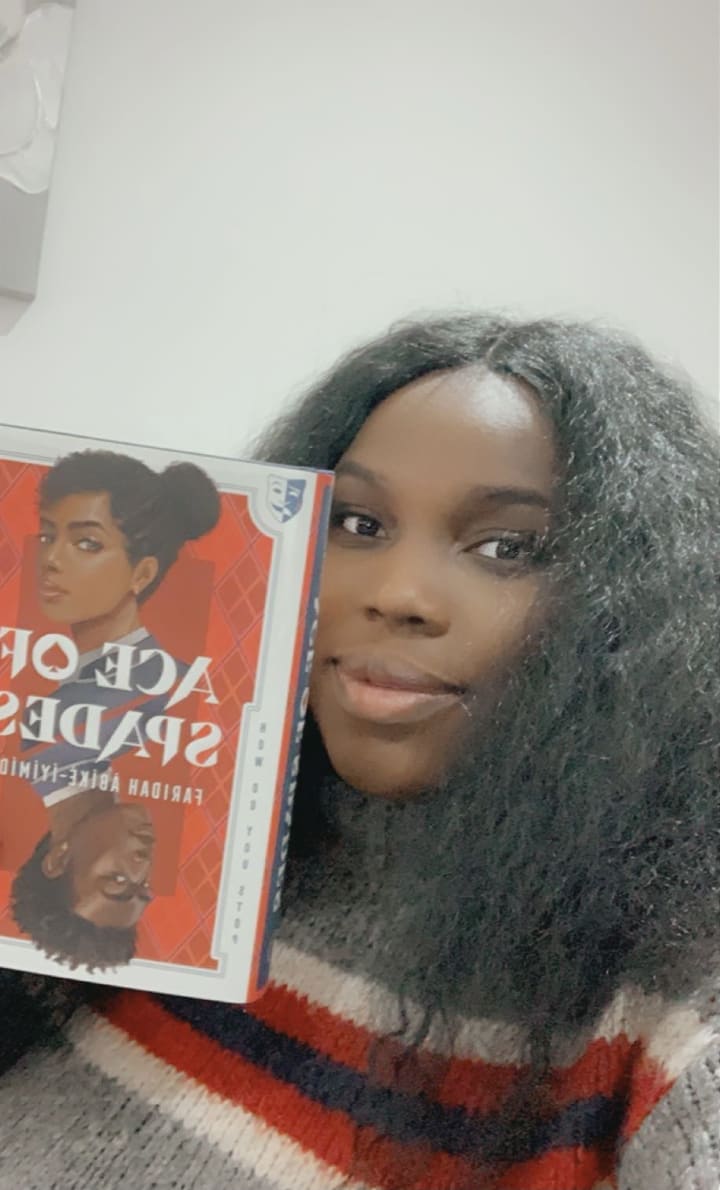 Faridah wished to see stories that had people that looked like her so she decided to just go ahead and write one. She started writing a story about a talented musician named Devon and a head girl named Chiamaka, both of whom are the only two Black students in an overwhelmingly white school named Niveus Private Academy. She decided the story would be a thriller and after a few months of writing, Faridah had written a complete story titled Ace of Spades.