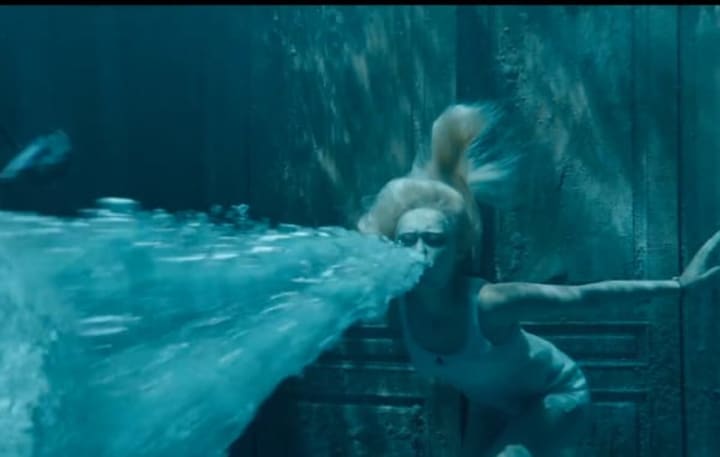 This is where the rewrites get most fascinating. Let me focus on one particular Peculiar character; Emma, brilliantly played by Ella Purnell. In the book, Emma is a pyrokinetic, able to manipulate fire; the film switches her ability with that of Olive (played by Lauren McCrostie). So the Emma of the movie is lighter than air, needing to be anchored to the ground. Her Peculiarity — the ability to manipulate air — is a beautiful and entertaining one. Burton uses this to tremendous effect, introducing a shipwreck that Emma raises from the sea bed to give the Peculiars the chance to pursue Barron.