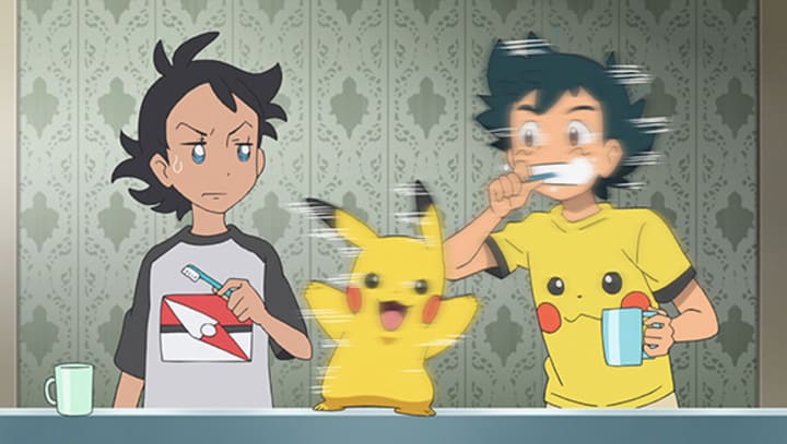 The scene above perfectly represents just how opposite Ash and Goh's personalities are; Ash, in pajamas depicting his best buddy, no less, tries brushing his teeth by shaking his head until he and Pikachu are both dizzy, while Goh stares him down as if wondering if there's something wrong with him. This extends into their conflict of perspectives: Ash is shamelessly idealistic, childish, and outgoing in his actions and goals, while Goh is reserved, mature, and scientific. This comes to a head in Episode 3, when they bicker about whether or not to help an Ivysaur climbing up a wall; they each believe they have the "correct" perspective on the situation, with Ash adamant about helping the creature himself while Goh insists that if he does help it, he'd only hurt its chances of natural survival later. They perceive the other as cruel or just simply wrong, and until the end of the episode they stubbornly try not to talk to each other. However, it becomes apparent that they can't continue their research mission without working together, and after accepting his help with a tough climb up the titular tower, Goh starts to understand Ash a little more and, for the first time, tries to make a genuine friend out of him.
