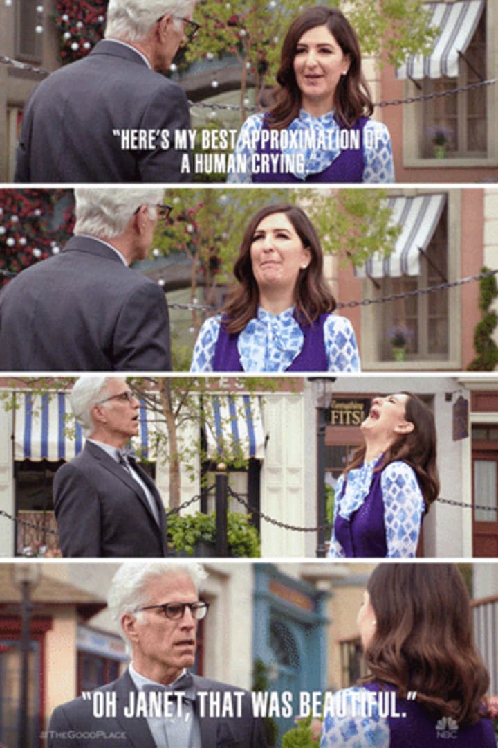 Reason #3: You can learn so much from it. I spent just as much time absorbing information about moral philosophy and ethics as I did laughing my snot out as well as any milk I happened to be drinking at the time. If you are interested in the best way to puke while watching The Good Place, which I have to believe you are if you clicked on this link, I would recommend watching with someone who is drinking a big glass of milk. They're certain to start drinking at the wrong time and belt it out of their nose, causing any nearby stomachs to void their contents.
