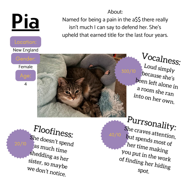 Boots: A snuggler who constantly wants to be left alone. Boots is the ultimate paragon. The quietly innocent (but really the instigator) of the pair, she’ll claim any warm space as her own (your blanket, lap, and even head are never safe).
