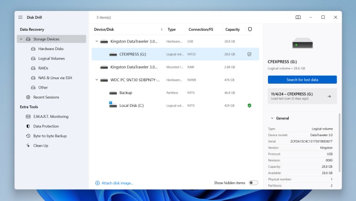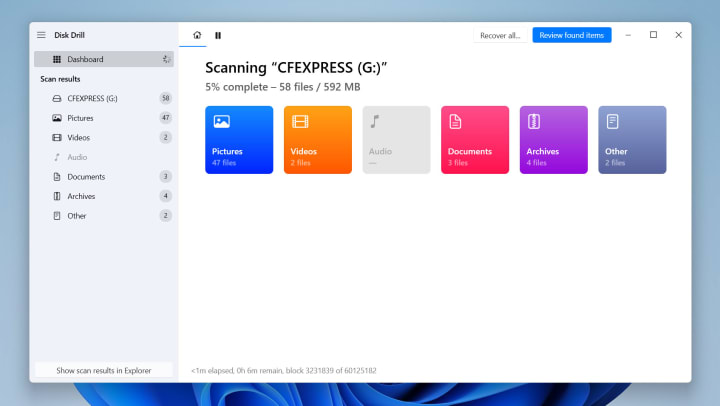 We had to test a lot of CFexpress recovery software, but the best one for us was Disk Drill. We chose it because it is able to recover both deleted files and recover formatted CFexpress cards. It also supports recovery and preview of photos and videos in RAW format, which are often stored on CFexpress cards used in cameras.