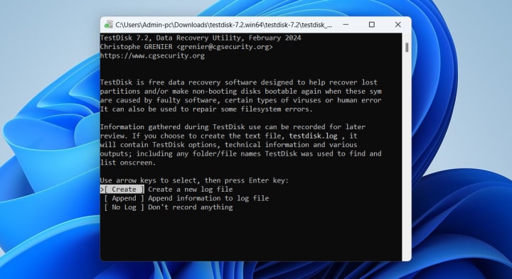 3. When TestDisk starts, it will ask you whether to create a log file of the actions performed. Select ‘Create’ to start a new log to track the steps taken during recovery.