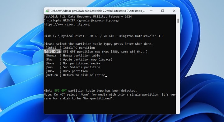 5. TestDisk should automatically detect the correct partition table type (e.g., EFI GPT, Intel, Mac, etc.). Confirm the suggested type, or choose manually if you are certain of the specific type used by your card.