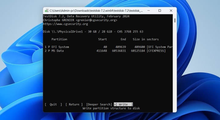 7. Once the scan is complete, TestDisk will list any partitions it finds. Select the partitions you wish to recover, and choose ‘Write’ to write the new partition structure to the disk.