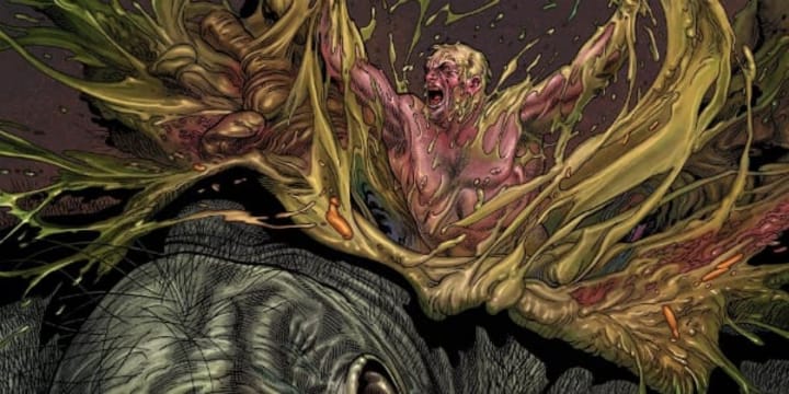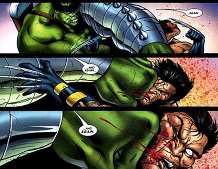Once the rumored (we wish) storyline for Wolverine 3, Old Man Logan is arguably the only time we have ever seen Wolverine defeat Hulk...I know, who knew it was even possible? We challenge you to find a better image than an aged Wolverine bursting out of apocalyptic Hulk's body! The Hulk/Banner we have is a Thor-murdering monster, which some say was created created when the radiation finally wormed its way inside Bruce's skull. After the massacre of superheroes, Banner marries She-Hulk and they have generations of children known as the Hulk Gang. Wolverine owed rent to Hulk's offspring and Banner killed off Wolverine's family, which set this battle in motion. In a Kill Bill fashion, Wolves kills off the Banners one by one, before confronting the big man himself. Hulk confesses that he wanted a fight like their "old days", and boy do we get one! Being devoured by Banner, Logan heals in his stomach before bursting out in full Little Red Riding Hood style - someone pass the indigestion tablets!