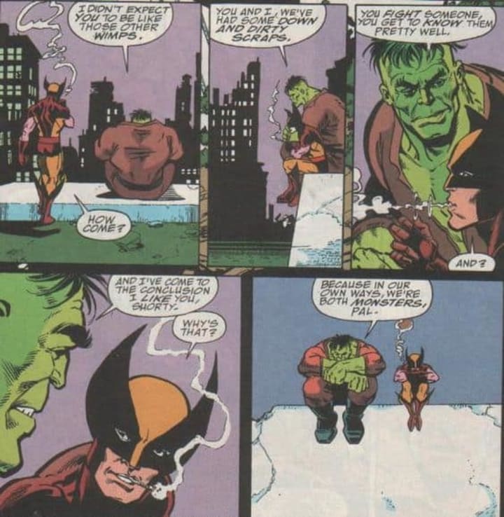I isn't all Doctor Doom and gloom though. During "Infinity Gauntlet #3" the pair share a rare moment of clarity on a rooftop. Whilst the rest of the world is caught up in the hype of Thanos, Wolverine and Hulk take a moment out to reflect on their bloody history together. Unfortunately the truce never gets a chance to reach its full potential as Wolverine soon has his skeleton obliterated by Thanos! Don't worry, it was one of those typical short-lived Wolvey deaths, and he would go on to chop off Thanos's arm eventually.