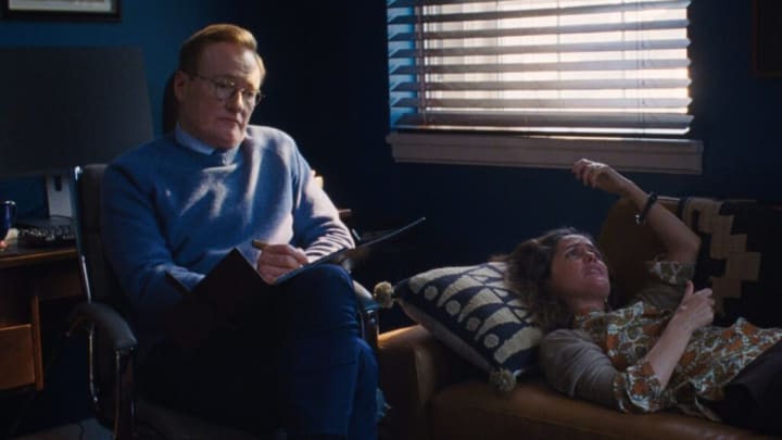 And then there’s her own therapist, played by Conan O’Brien in a rare dramatic turn. These sessions are agonizing — awkward, blunt, and honest in the worst way. Linda’s attachment to him is unhealthy, and both of them know it. The tension only increases because they work in the same building, passing each other in hallways that shrink with every encounter.