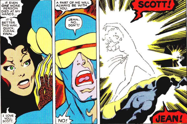 Terrified after Dark Phoenix literally consumed an entire star, committing an act of genocide, an alien race known as the Shi'ar sentenced Jean to death. It all led to a fateful battle on the surface of the moon, with the X-Men battling for Jean's life. Ultimately, Jean chose to commit suicide rather than risk unleashing the evil of Dark Phoenix once again.