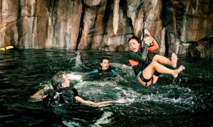 A group of teens plan on spending some time exploring the underwater caves that one of their dads is currently working in. It's full of ancient carvings and stone structures and a really awesome way to spend some time in the summer. Everything is going great until one of the girls get spooked. She's not entirely sure what she saw, but she knows there was something there. A simple error leaves them trapped inside of an underwater cave collapse and they must find an alternative route out. What they don't know, and very soon will find out, is that these caves a filled with starving and blind cave sharks.