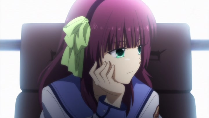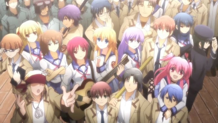 A guy dies, he goes to heaven (sort of but not really) in order to leave this place he needs to be content/happy but the not-yet-dead-battlefront (the name of the main group of characters) has decided that they've got unfinished business (see the plot of casper). It's a nice idea to give these kids a life they never had, and the way to do that is by having them go to a regular school (because that's the source of eternal happiness) Because by being a regular kid you can be freed of this purgatory even though everyone can tell the difference between the NPCs (they names that the characters in show give them) and real humans. Angel/Kanade Tachibana is the school class president so of course she has ultimate authority (not an actual complaint a lot of anime series do this) but she also has upgrades beyond that of everyone else through a computer system. She's not a robot though, she's an actual human. This never really gets explained as to why she's stronger. She just is. Everyone else can make guns out of dirt so they shoot at her whenever things go nuts. In order to distract the NPCs during operations against Angel a band plays music in 3d animation. It works for a little while, it's how the NYDB gets their meal tickets, because I guess they don't get to eat otherwise. Even though they can't die in that world anyway if they don't eat.