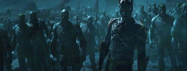 When Thor, Banner, and Valkyrie arrive on Asgard, Hela's forces are about to decimate the rebellious Heimdall and the Asgardians he's protecting. Banner becomes the Hulk (after a painful fall down to the Rainbow Bridge) and battles Hela's resurrected Fenris Wolf and the undead forces led by Skurge.