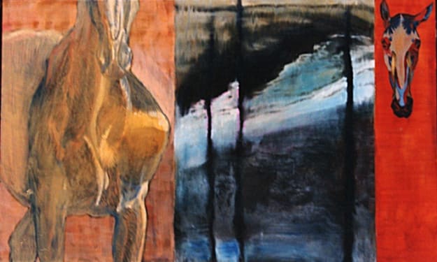 Well, you see, in my mind, I had traipsed through the streets of Paddington in Sydney in the rain in blue, aqua and black bodypaint, sprinkled with with a fine dusting of rainbow glitter, and wiggled my freckled bottom during Mardi Gras in 2002 (dressed as a fish swimming around a Centurion’s Galley). I was only gawked upon by an obese leather-bear, who clapped madly in the crowd from the footpath. I had made eyes with bright and svelte muscled Sydney-siders in white hot-shorts, only to be sneered at and dismissed with a snigger. But, here I was inspired to create, in an arcane fusion of Hengst and Hrosa, of Sire and Dam, their forms constructed as if by the hand of a talented Australian University trained sculptor (you see I had a wonderful pettite Ginger female friend, a platonic acquaintance, who wired and hewed into Styrofoam in the sculpture department there); forms as if enclosed by welded steel rods: a kind of monochromatic Picasso-Braque embodiment of two Horses. They stand like Russian Realist neddies, divested of all pretence, where some limbs are truncated, to please the thrust of their three dimensional bodies, a strength in physicality only matched by their spiritual growth. They actually stand, hovering over a magnolia, an image stolen (how very Postmodern) from the front cover of a Madonna “best of” magnetic tape album that I owned.