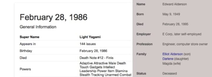 The basic similarities would be the two having a younger sister and they are both 28-years-old. The only difference is their birthdays, which is September 17, 1986 for Elliot Alderson and February 28, 1986 for Light Yagami. But guess who died on February 28, 1995? His father, Edward Alderson, who is also his interpretation of what Mr. Robot looks like. Within this theory, it could be the reason Mr. Robot — Elliot's twisted alter-ego — uses Elliot's father's date of death for Light Yagami's date of birth. It's nuts, but it's plausible.