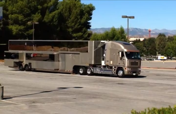 This large personal movie trailer and living area covers 1,200-square-feet and sits on 22 wheels with 14 TV screens, 30,000 worth of leather, and $125,000 dollars worth of technology.