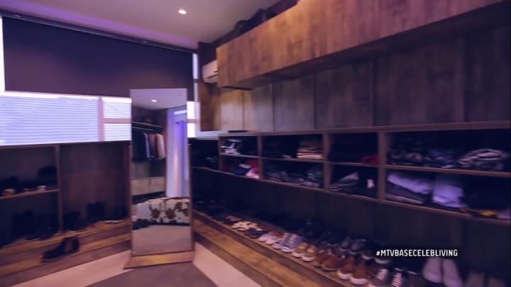 Timaya has an expansive closet that takes up a huge part of his bedroom. The closet has a very earthy aesthetic because of all the brown wood and brown cow skin.