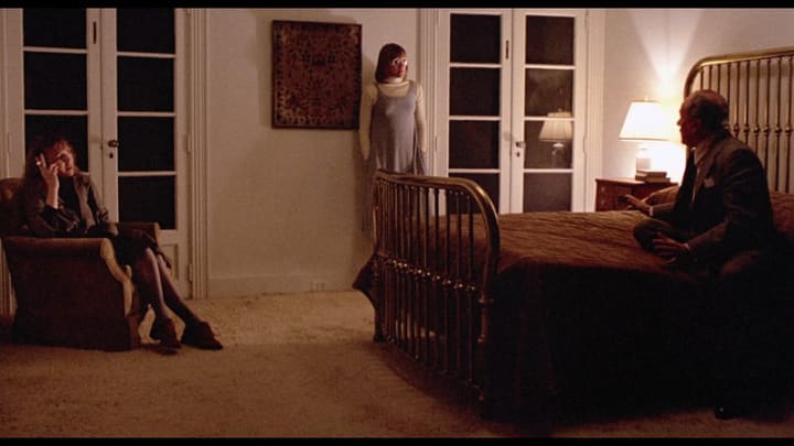 At the outset we are made aware, by a camera exploration of their sterile house, that the marriage of Arthur (played by E.G. Marshall) and Eve (played by Geraldine Page) is a dead thing. This knowledge is underlined by the first scene in which Eve— who permits herself to be shown looking old and unattractive, her hair sternly drawn straight back into a bun on top — is pushing her decorating ideas onto her younger daughter Joey (Mary Beth Hurt) and the man she is living with, Mike (Sam Waterston), ideas which do not fit their lifestyle and which they cannot afford.