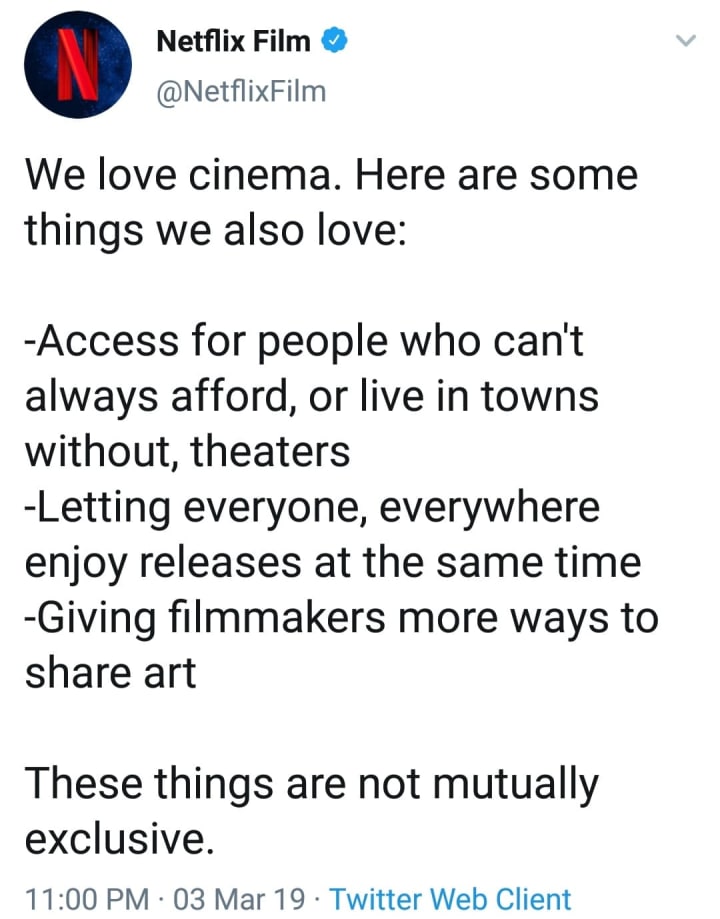But he's fighting the wrong thing. My two cents: Let Netflix win awards. If Spielberg is concerned about smaller indie movies being denied theatrical distribution, then he should be campaigning for the studios to take more chances on those smaller movies, not fire shots at the companies who are.