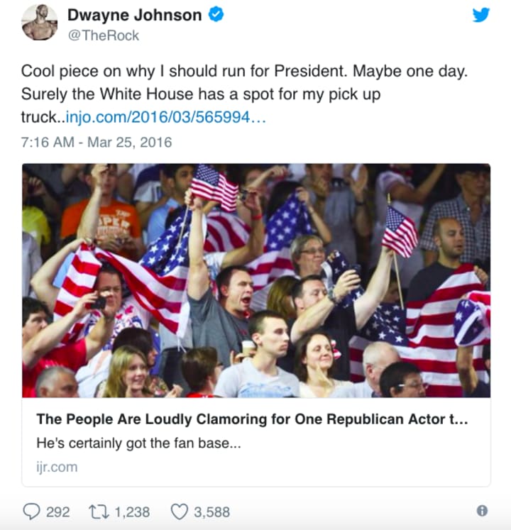 Well, that certainly sounds like a moving speech of an inspiring President-in-waiting. If The Apprentice boss can get in there with a toupee, and Terminator can run California, why not the man from Moana? Dwayne "The Rock" Johnson is already the nation's sweetheart, and I think this year has brought the question home, "what is the worst that could happen?"