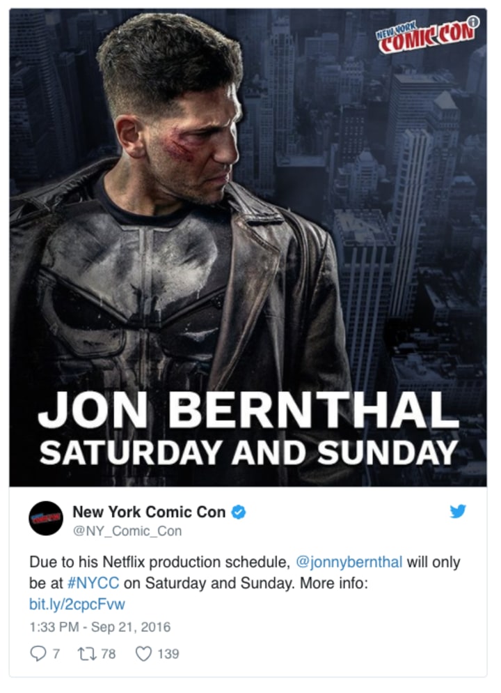 Supporting this, Screen Geek has released a strong rumor that The Punisher will begin filming later this year under the code-name "BULLET TIME" (according to Screen Geek, The Defenders will be filmed under the code-name "FEARLESS", which seems highly likely). Jon Bernthal's schedule for New York Comic Con seems to confirm this: