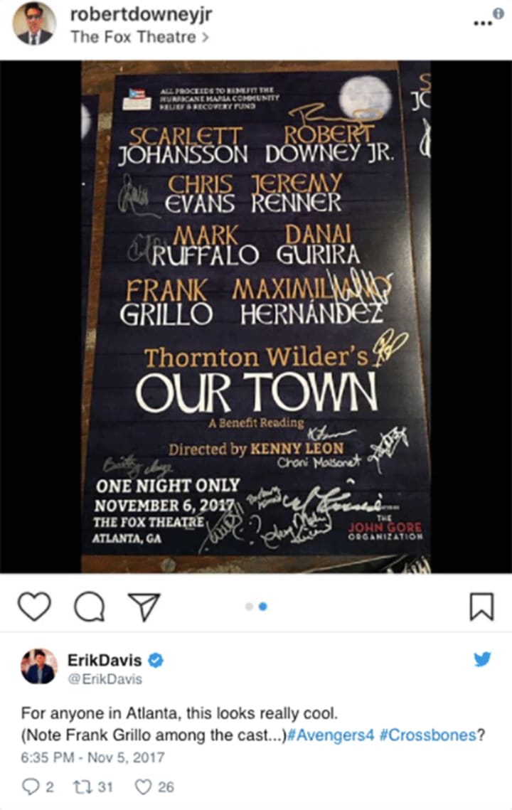 Not only is Grillo in Atlanta right now, he's also participating in a charity reading alongside some of the MCU's top names. They're also joined by Maximiliano Hernandez, otherwise known to Marvel fans as duplicitous S.H.I.E.L.D. turned Hydra agent Jasper Sitwell. Sitwell is another character who met an untimely end in a previous Marvel movie, killed by the Winter Soldier in the second Captain America film.