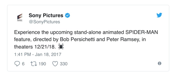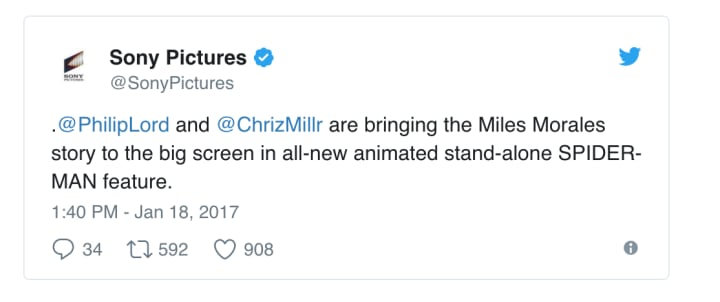 Over the past few months, rumors that Miles Morales would star in Sony's 2018 animated Spider-Man movie began to crop up and now they've been officially confirmed via Sony Pictures official Twitter account.