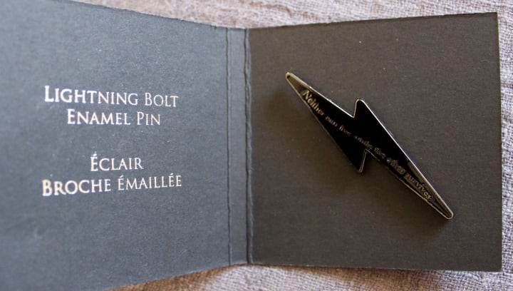 Last item as always is the pin- unfortunately, mine came damaged, so my apologies for the poor photo. This lightning bolt pin is supposed to say "Neither can live while the other survives," which is semi-visible on mine but the enamel is a little warped. I didn't want to bring this up to Loot Crate's customer service because I don't really care for the pin itself. However, this is a unique pin design that is subtle and perfect for showing your Potter Pride. These pins are usually what makes these boxes worth the whole experience, but I just wasn't thrilled with this one, even though it is a neat concept.